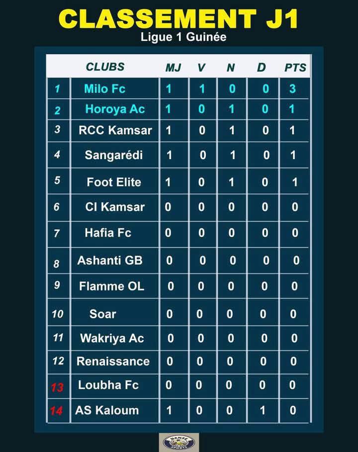 Ce qu’il faut mentionner, c’est qu’à l’issue de cette première journée, le Milo FC de Kankan occupe déjà la première place avec 3 points, suivi de Horoya AC, RCC Kamsar, Sangarédi et Foot Elite de Coleah tous avec 1 point chacun.