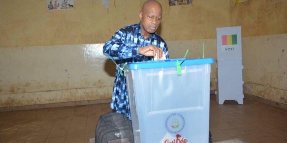 Conakry_Guinée : le Président de la Haute Autorité de la Communication (HAC), Boubacar Yacine Diallo, a accompli son devoir citoyen en glissant le bulletin de vote dans l’urne au bureau N°2 à Matoto Centre.