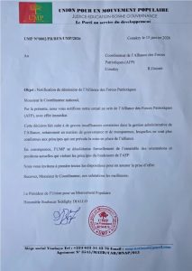 Dans cette lettre adressée au Coordinateur national de l’AFP, le président de l’UMP, l’Honorable Boubacar Siddighy Diallo, invoque de graves insuffisances dans la gestion administrative de l’Alliance, notamment en matière de gouvernance et de transparence.