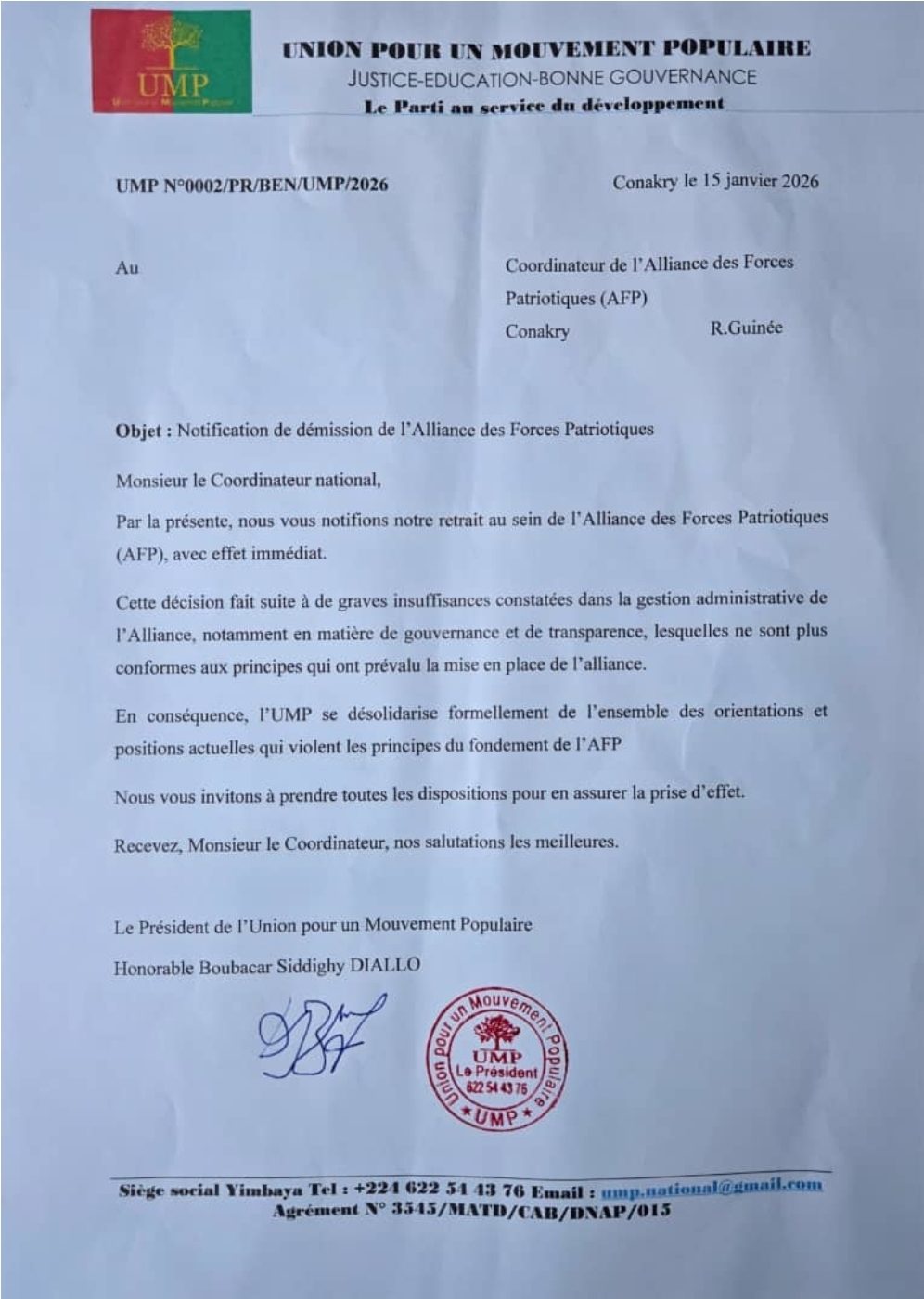 Un tournant politique important vient d’être acté en Guinée. Dans un communiqué officiel daté du 15 janvier 2026, l’Union pour un Mouvement Populaire (UMP) a annoncé sa démission immédiate de l’Alliance des Forces Patriotiques (AFP), marquant ainsi une fracture majeure au sein de la coalition politique.